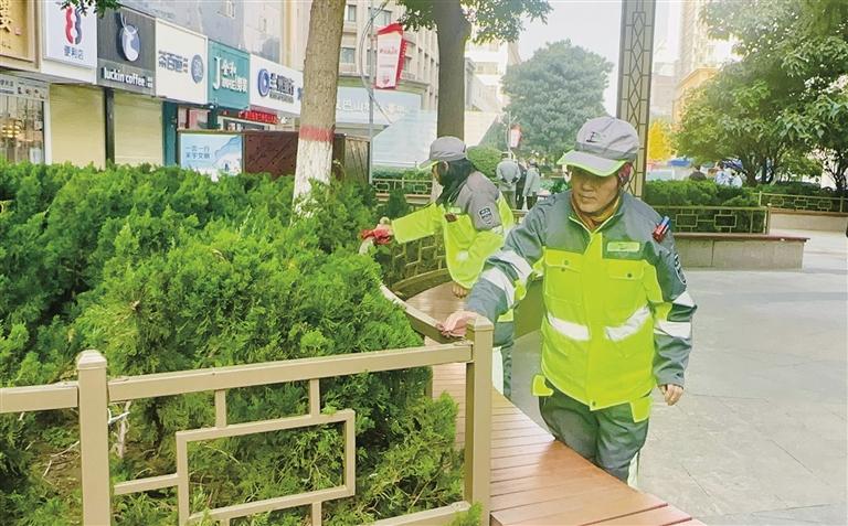 在张掖路步行街中段,电动扫地车沿着既定路线高效清扫路面;休闲区内,环卫人员各司其职,有的擦拭座椅护栏,有的清扫路面垃圾。其中一位工作人员手持电吹风,细致地将座椅下方难以清理的枯叶吹出,全力为市民打造干净整洁的休闲空间。“早上锻炼,下午约牌友来这儿打牌、晒太阳,环境好。”刚结束晨练的李大妈笑着说,看着整洁的环境,自己也会主动爱护。