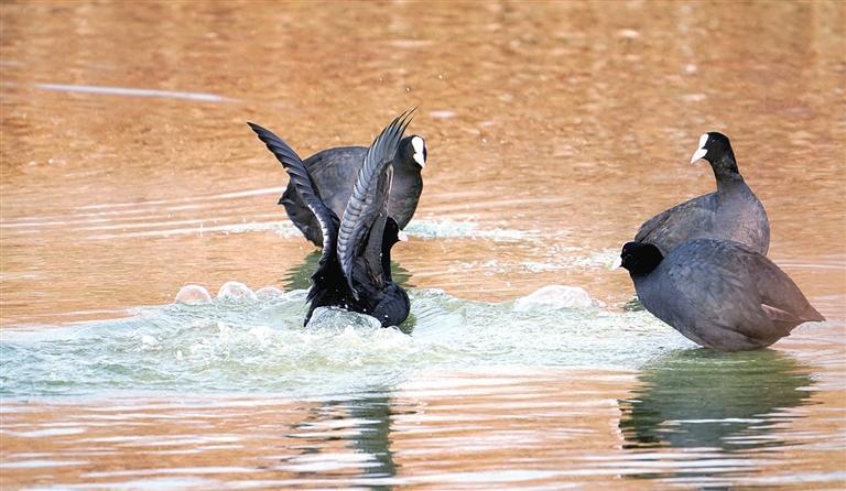 白骨顶鸡在湖中扇动翅膀嬉戏。 兰州新区报记者罗晋业 摄