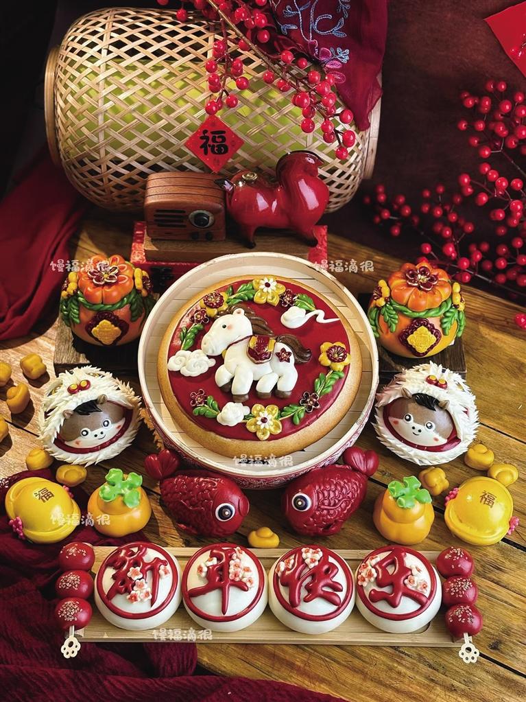 如果说养生馒头赢在健康、味道,那新中式花馍则胜在颜值与美好寓意。“馒福滴很”新中式面点工作室里,馒头化身精致艺术品:新年小马造型憨态可掬,柿子花馍寓意“事事如意”,还有糖葫芦花馍、专为孩子定制的百日宴生肖花馍、婚礼囍馍,每一款都十分精致。