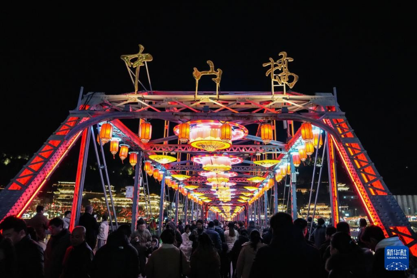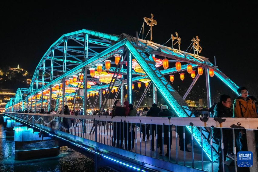 2月10日,甘肃省兰州市在兰州黄河铁桥中山桥、东方红广场等城市地标及城区主干道布置的灯饰灯组正式接电亮灯,营造出喜庆祥和的新春佳节氛围。