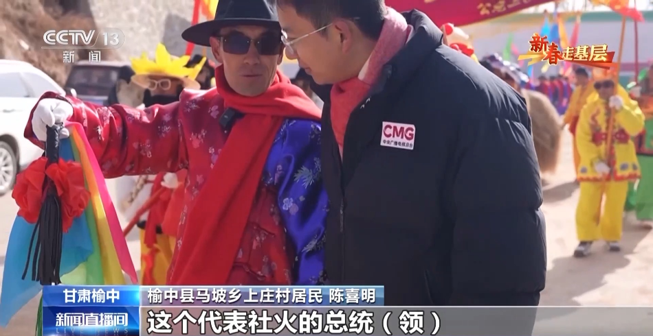榆中县马坡乡上庄村居民 陈喜明:这个代表社火的总统领,是给我们引场子的,社火就是把大家召集到一起,前段时间这里遭灾,搞个社火把大家的精神提一提。