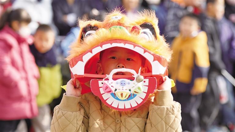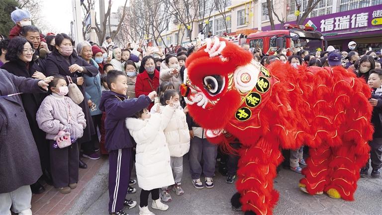 舞狮的队伍更是吸睛。雄狮精神抖擞、矫健灵动,踩着鼓点腾挪跳跃、搔首摆尾,高台抢绣球、翻转展英姿,尽显威猛气势。教育系统社火队的两条长龙随鼓点翻腾,龙头昂首摆尾间,龙身时而直冲云霄,时而贴地盘旋,引得人群中爆发出阵阵惊呼。