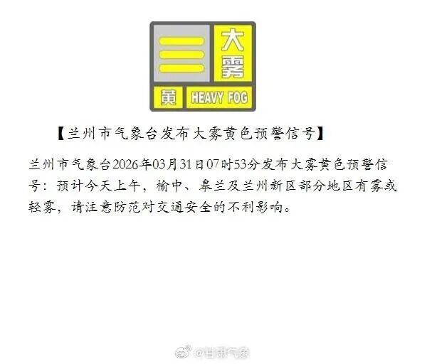 兰州市气象台2026年03月31日07时53分发布大雾黄色预警信号: